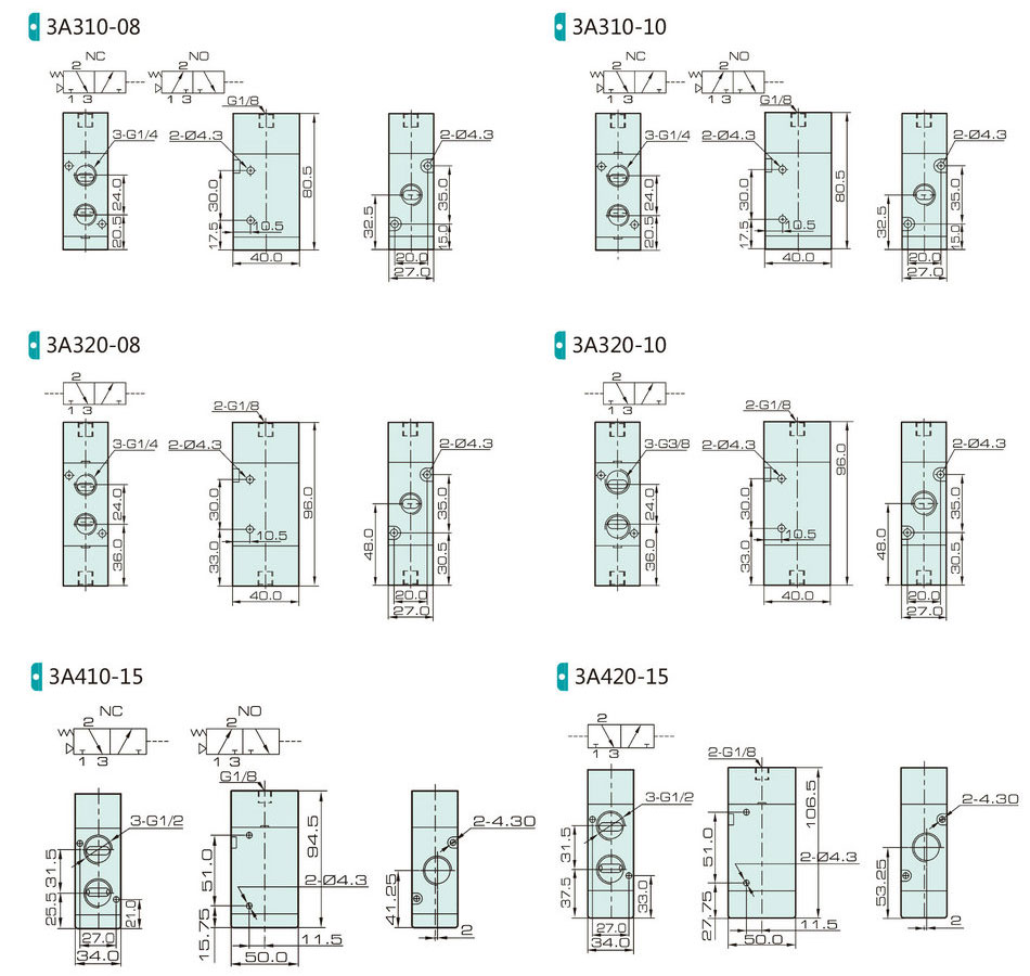 インレット、アウトレット、排気ポートM5×0.8 | インレット、アウトレット、排気ポートG 1/8インチG | ||||||||