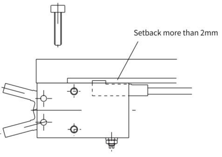 上記の図に示すように、センサーを取り付け面の側面に使用する場合、端面からのセンサー取り付けシリンダが突出されているため、取り付けプレートは2mm以上のset折で設計する必要があります。
