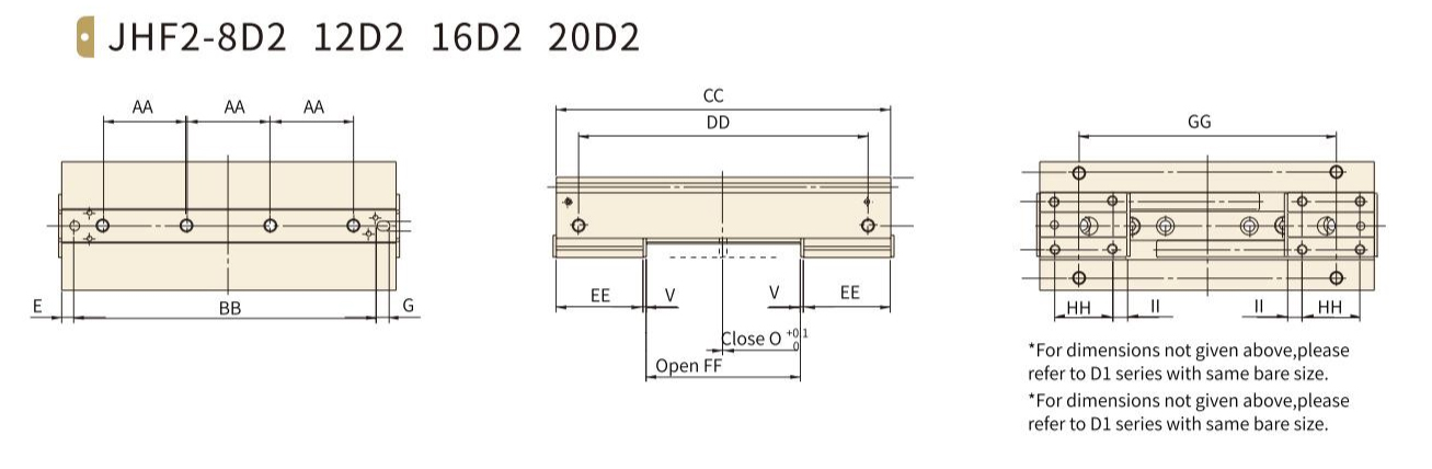 | JHF2-16D | 20 | 25 | 1.2 | 16±1 | 20 | ∅4.3 | ∅7.5 | 36 | M4×0.7 | 4 | 15 | 5 | 20 | 43 | ∅3H9+0.0250 | 3 | - | - | - |