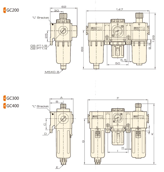 | GC300-08 | 71 | 41.5 | 35 | PT1/4 | PS1/8 | 188 | 143 | 6.5 | 64 | 9 | 188 | |