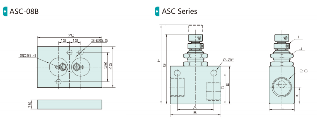 | ASC-08 | 26 | 36 | G1/4 | 22 | 27 | 4.3 | 49.7 | 56.5 | M6x0.5 | M12x0.75 | 12 | 18 |