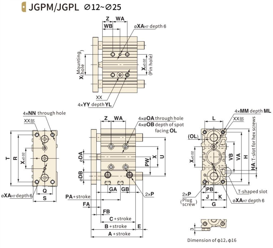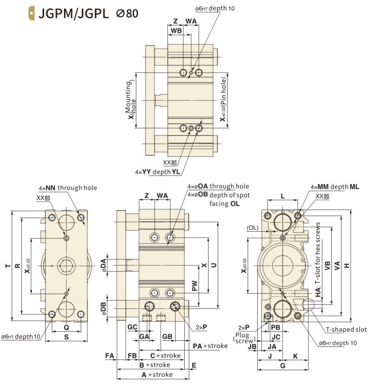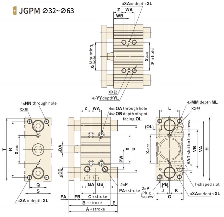 | 内径サイズ(mm) | 標準ストローク(mm) | B | V | DA | FA | FB | G | GA | GB | H | HA | J | K | L | MM | ML | NN | OA | OB | OL | P | PA |